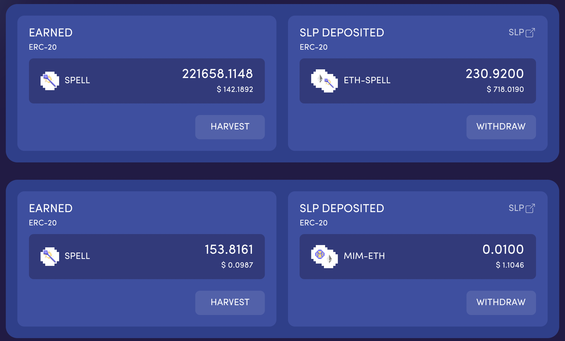 Web sitesinin FARM sayfası, kullanıcının likidite havuzu tokenları ve SPELL eklemesine izin verir.