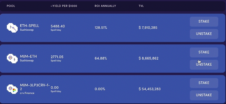 abracadabra kullanıcıların LP tokenlarını SPELL toplamak için stake edebilecekleri farklı çiftçilik fırsatları sunar. Bu mekanizma, belirli çiftlerde derin likidite tutmak için kullanılır. Farming şu anda ETH-SPELL ve MIM-3CRV LP tokenları için Ethereum’da mevcuttur. LP çiftleri için gelecekteki teşvik programları, yönetişim portalı yayına girdiğinde yönetişim süreci aracılığıyla oylanabilir.