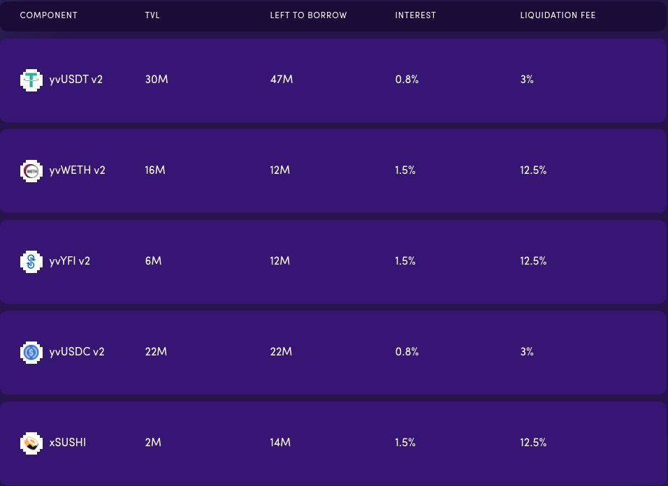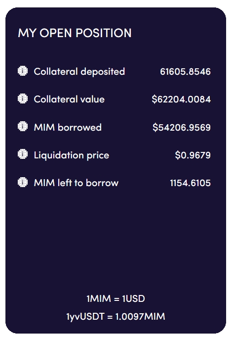 ** 1yvUSDT = 1.0097MIM** - Bileşenimizin mevcut fiyatıdır, (bu durumda yvUSDT ). Bu sayı likidasyon fiyatına eşitse, likidasyon için işaretlenirsiniz.