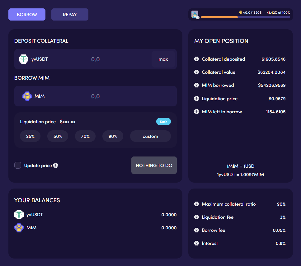 • MIM Borç Alma - Sahip olduğunuz MIM’in toplam değeri ve ödünç alınan miktarıdır. Protokol her zaman 1MIM’i 1USDT olarak değerlendirir.