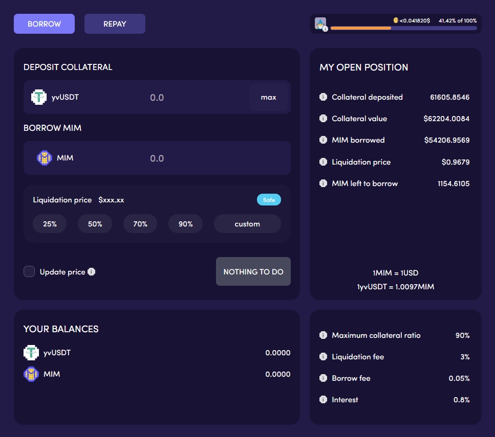 MIM Borç Alma - Sahip olduğunuz MIM’in toplam değeri ve ödünç alınan miktarıdır. Protokol her zaman 1MIM’i 1USDT olarak değerlendirir.