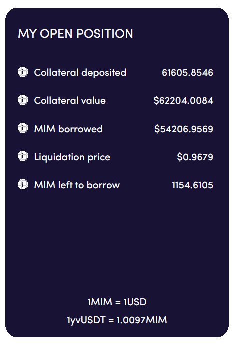 • ** 1yvUSDT = 1.0097MIM** - Bileşenimizin mevcut fiyatıdır, (bu durumda yvUSDT ). Bu sayı likidasyon fiyatına eşitse, likidasyon için işaretlenirsiniz.