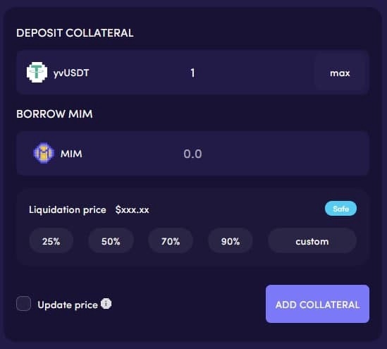 İlk olarak, ne kadar yvUSDT’nin teminat olarak kullanılacağına karar verin. Ardından, sayıları girerek veya aşağıdaki yüzde düğmelerini kullanarak ne kadar MIM ödünç alınacağına karar verin.