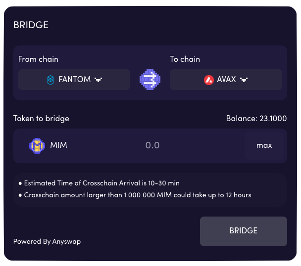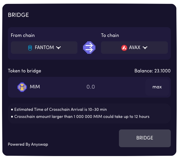 MIM Köprüsü MIM’leri doğrudan https://abracadabra.money/ Arayüzü üzerinde Anyswap Bridge ile köprüleyin!