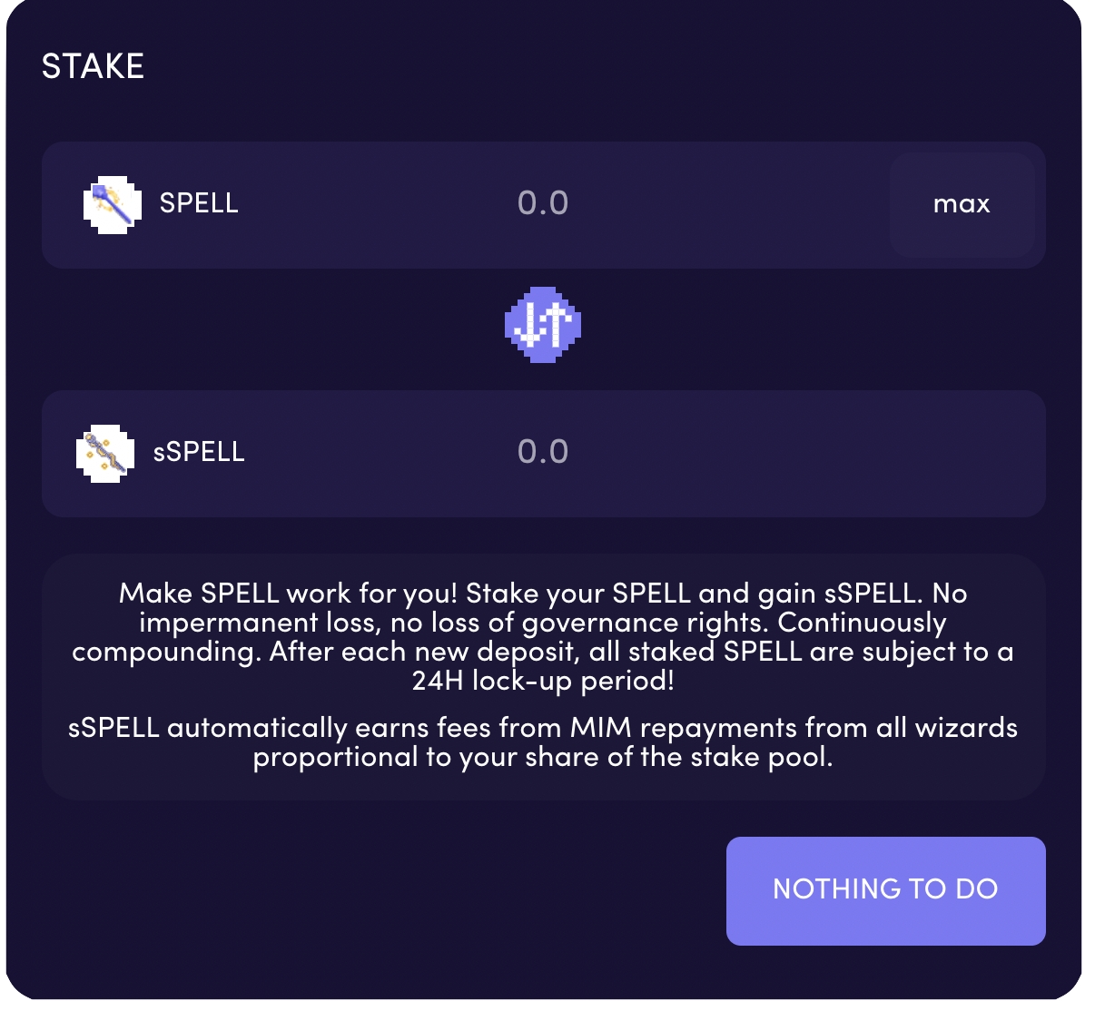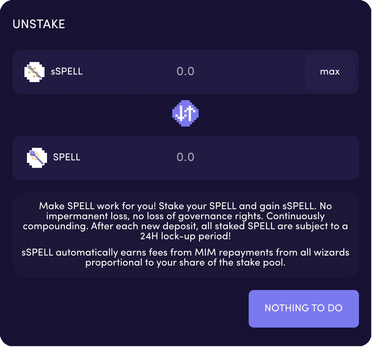 STAKE/UNSTAKE Penceresi: Kullanıcılar yukarıda gösterildiği gibi STAKE veya UNSTAKE arasında seçim yapabilecektir. Bir kullanıcı bu iki butona tıkladığında ya pozisyonlarına SPELL tokenleri eklemelerine ya da SPELL tokenlarını pozisyonlarından çekmelerine izin verecek bir açılır pencere ile karşılaşacaklar. Bu iki kare arasında geçiş yapmak için ortadaki iki oka tıklamanız yeterlidir.