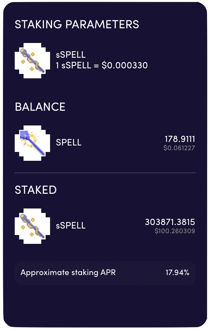Burada kullanıcılar, cüzdanlarında kaç tane SPELL veya sSPELL bulunduğunu ve bu tokenların dolar değerini kontrol edebilecekler. Bunun altında, kullanıcılar, geçen ayın protokolün yıllık gelirine göre hesaplanan, verilen Yaklaşık Staking APR’sini bulabilecekler.
