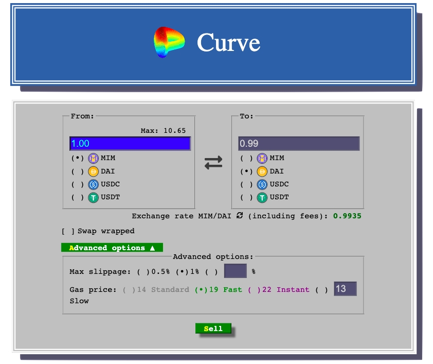 Takas etmek istediğiniz MIM miktarını girin ve takas etmek istediğiniz sabit tokenı seçin. Maksimum Fiyat Değişimi ve Gas Fiyatınızı seçin. Son olarak yeşil “swap” butonuna tıklayın ve işleminizi onaylayın. Artık MIM’leri başka bir stabilcoin ile başarıyla takasladınız.