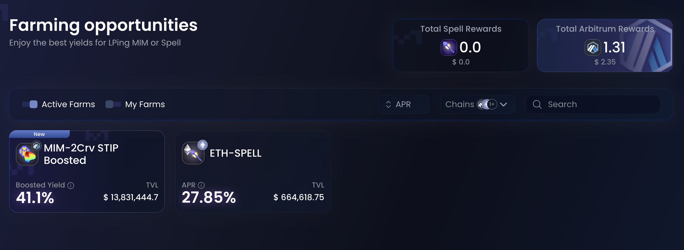 Farming positions can be accessed by going to More → Farms from anywhere on the interface. From here, you can view all farms, and can filter to only see active ones.